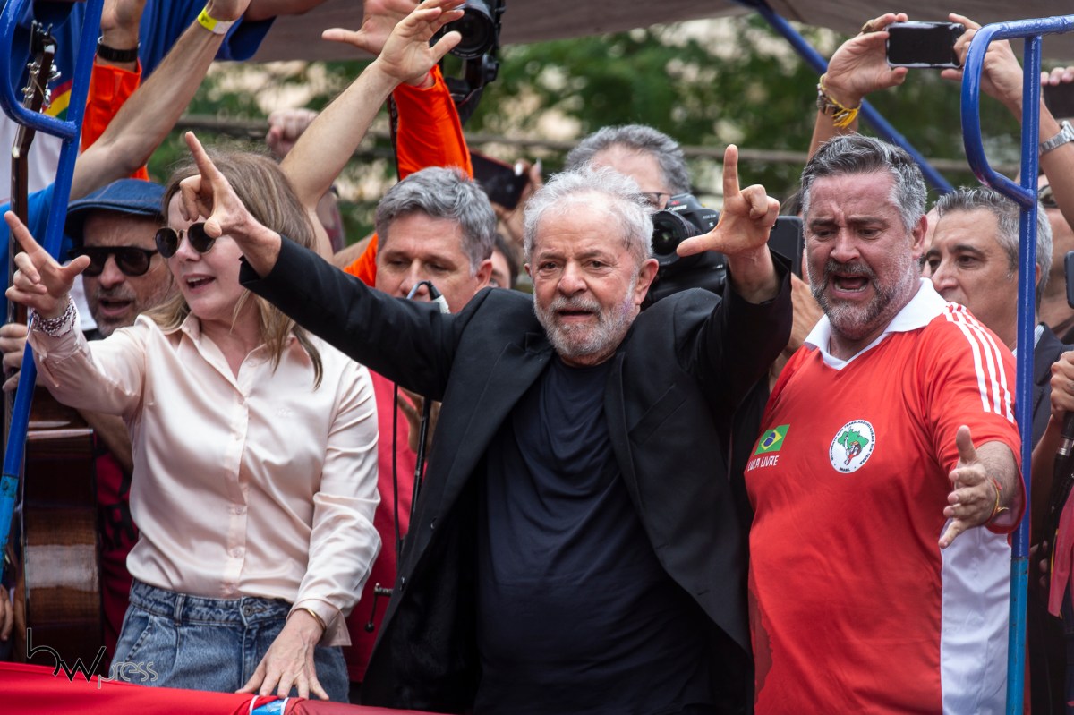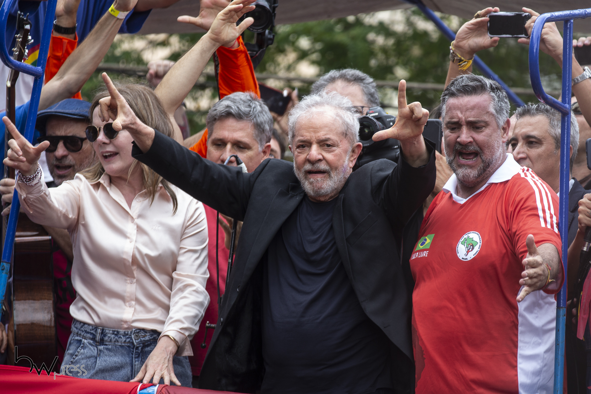 O ex presidente Lula participa de ato no Sindicato dos Metalúrgicos do ABC, na cidade de São Bernardo do Campo (SP), neste sábado (9), após ser beneficiado por decisão do STF sobre a prisão após condenação em segunda instância.