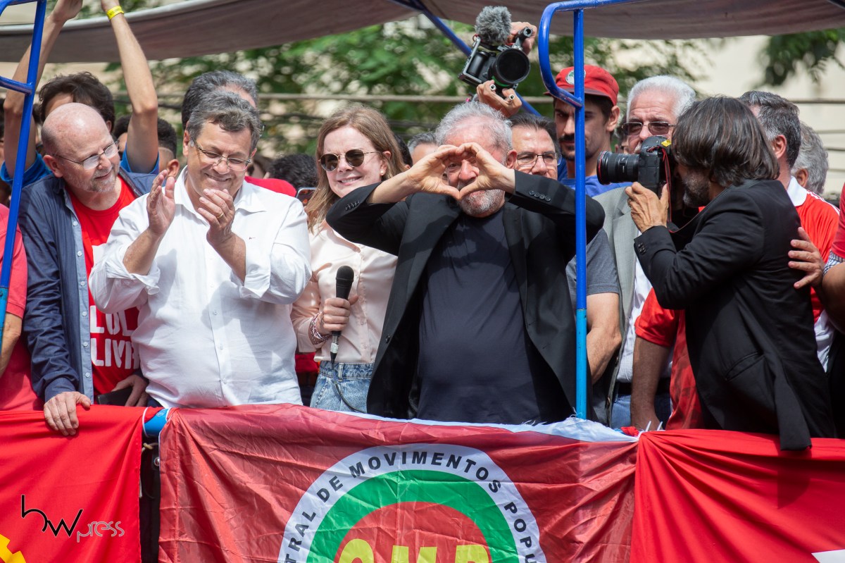 O ex presidente Lula participa de ato no Sindicato dos Metalúrgicos do ABC, na cidade de São Bernardo do Campo (SP), neste sábado (9), após ser beneficiado por decisão do STF sobre a prisão após condenação em segunda instância.
