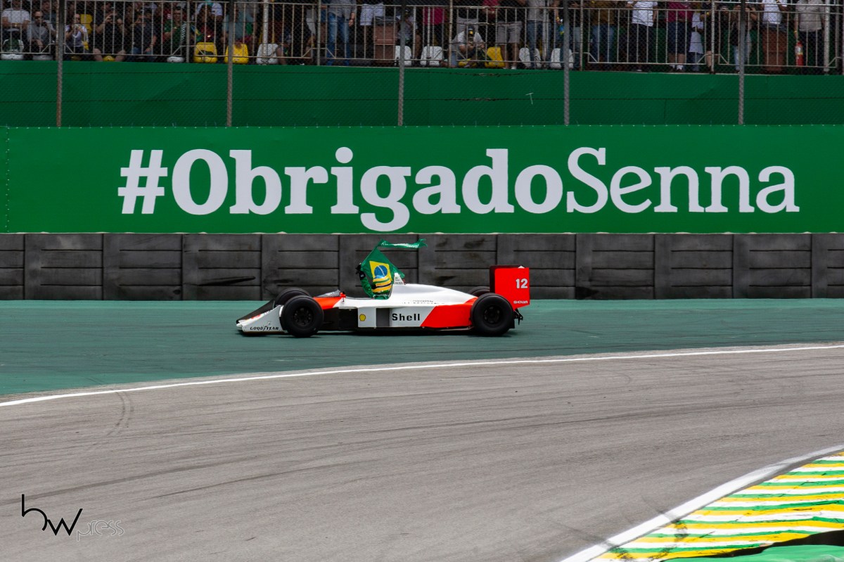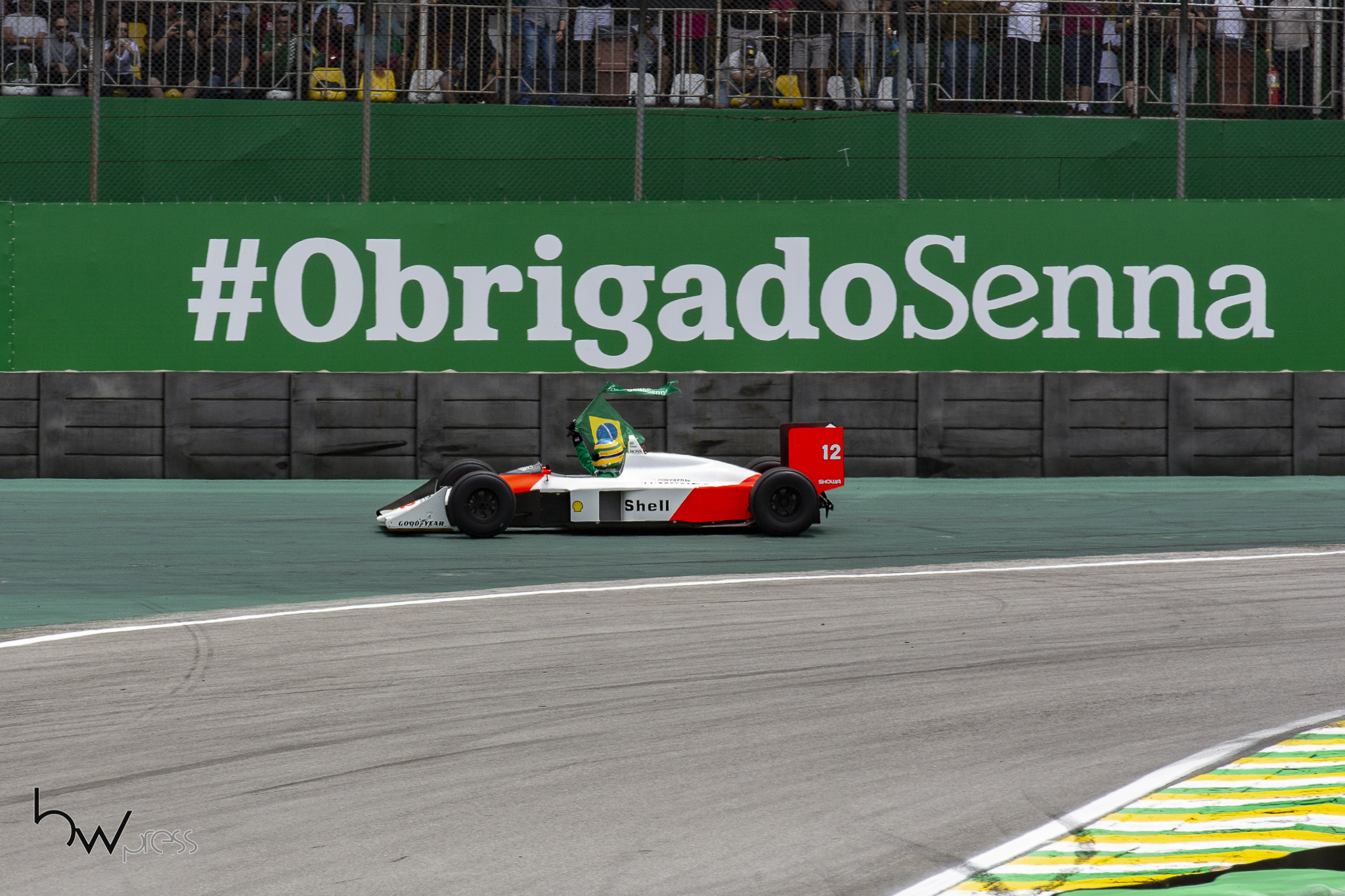 O piloto Bruno Senna dirige a McLaren MP4/4 antes do Grande Prêmio Brasil de Fórmula 1, no Autódromo de Interlagos, zona sul de São Paulo (SP), neste domingo (17).