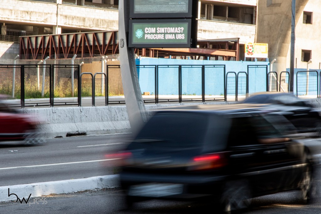 Relógio de rua exibe mensagem informativa sobre o novo Coronavírus – Covid19 – neste sábado (14), na zona sul de São Paulo (SP)