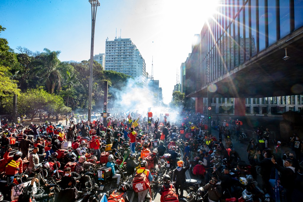 Motociclistas que trabalham com entregas por aplicativos fazem manifestação em São Paulo (SP), nesta quarta-feira (1). O grupo reivindica melhores condições de trabalho.