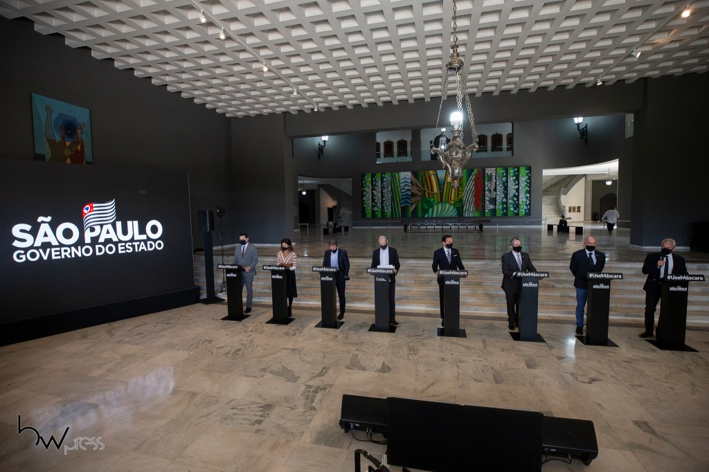 Entrevista coletiva no Palácio dos Bandeirantes, na zona sul de São Paulo (SP), nesta segunda-feira (27). O governo anunciou medidas para a retomada da atividade econômica e flexibilização da quarentena, decretada por conta da pandemia de COVID-19.