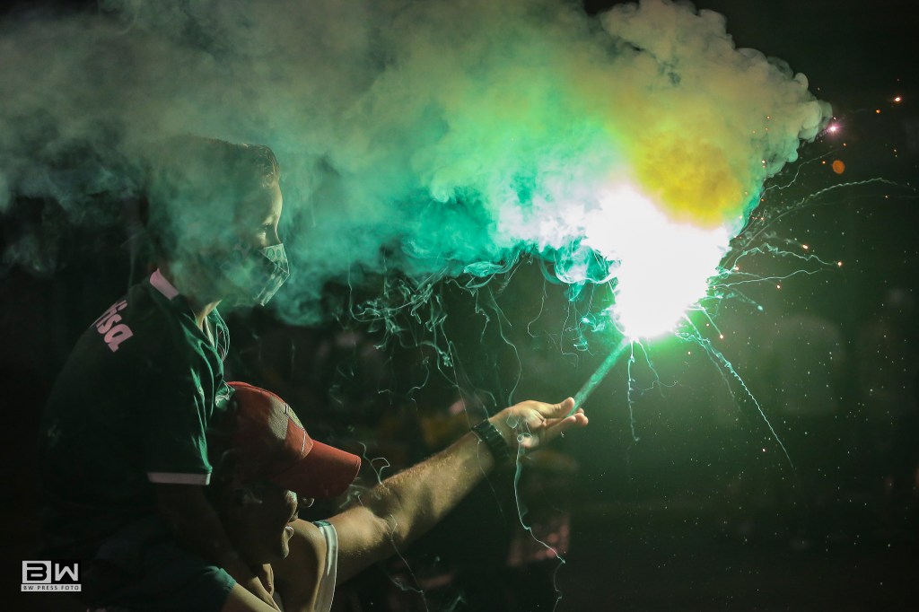Torcedores do Palmeiras fazem um corredor de sinalizadores no trajeto do ônibus que leva os jogadores do centro de treinamento até o Allianz Park, na zona oeste de São Paulo (SP). O time disputa uma vaga na final da Copa Libertadores, contra o River Plate, na noite desta terça feira (12).