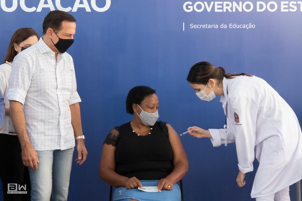 Início da vacinação contra a COVID-19, em trabalhadores da edução, na Escola Raul Brasil, na cidade de Suzano (SP), neste sábado (10). Na primeira fase da campanha, serão imunizados funcionários de diferentes funções, com idade acima de 47 anos.