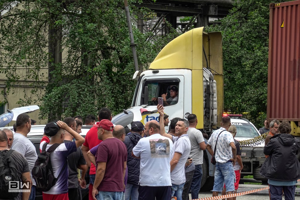 Caminhoneiros protestam na entrada do Porto de Santos, durante a greve nacional da categoria em 01 de novembro. Os manifestantes exigem a diminuição no preço do combustível, aumento do valor dos fretes e aposentadoria após 25 anos de trabalho.