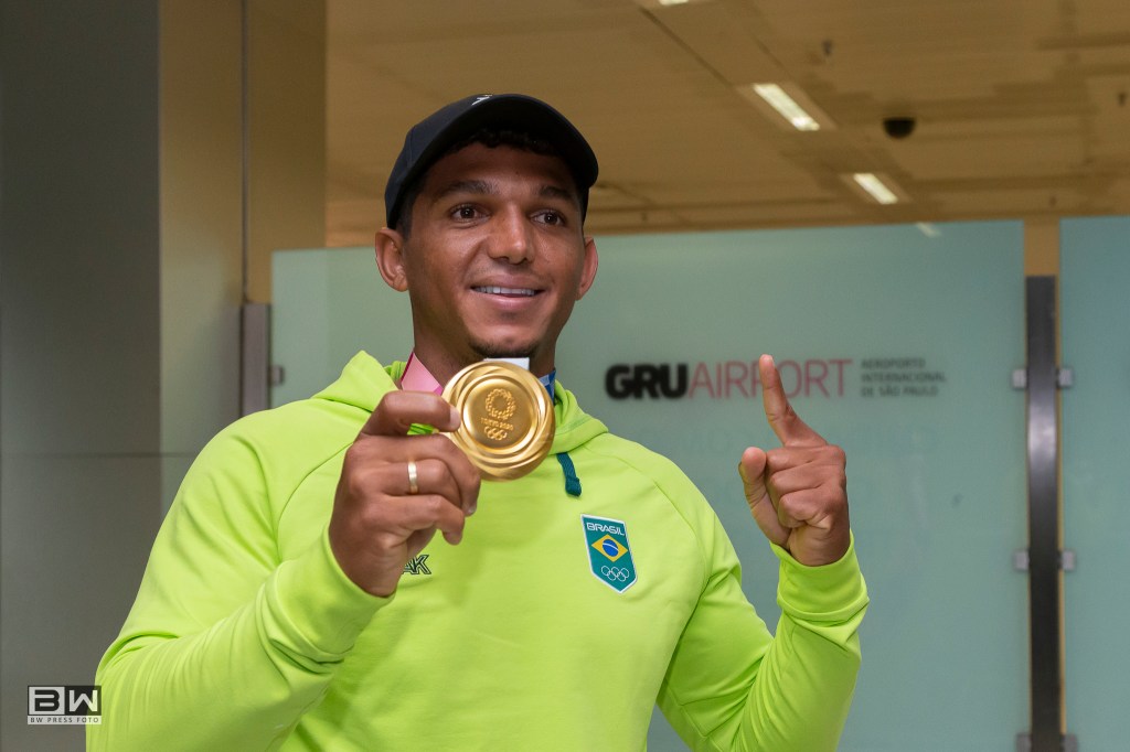 O canoísta Brasileiro Isaquias Queiroz, ganhador da medalha de ouro na prova C1 1000m da canoagem, desembarca no Aeroporto Internacional de São Paulo, em Guarulhos, nesta segunda feira (9).