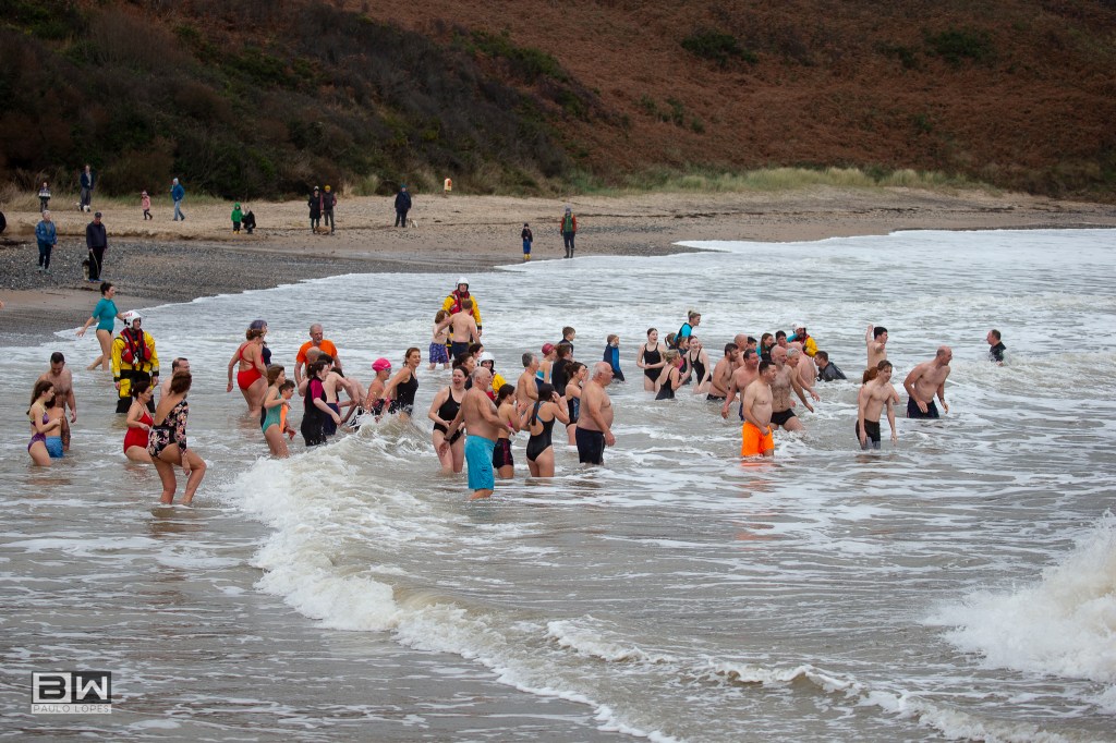 No dia de ano novo, nadadores enfrentam águas geladas no mar Irlandês, durante um dia frio de inverno, com temperatura de 9ºc, para realizarem a tradicional primeiro mergulho do ano, para arrecadar fundos para a caridade, em Ballymoney Beach, no condado de Wexford, Irlanda.