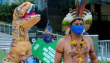 Indígenas e ativistas climáticos protestam na frente da sede do banco BTG Pactual, em São Paulo, em Novembro, 04. Os manifestantes denunciam ações do banco BTG Pactual, o maior banco de investimentos da América Latina, que investe em empresas que exploram petróleo e gás na Amazônia. Álbum completo no FLICKR PAULO LOPES @ BWPressFotoCOPYING OR…