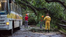 Árvore de grande porte cai sobre um automóvel e um ônibus escolar, na Avenida Professora Virgília Rodrigues Alves de Carvalho Pinto, no bairro do Tucuruvi, zona norte de São Paulo (SP), nesta segunda feira (12). No automóvel estavam 3 pessoas, que foram resgatadas sem ferimentos. O ônibus estava vazio. © BW PRESS COPYING OR REPRODUCTION…